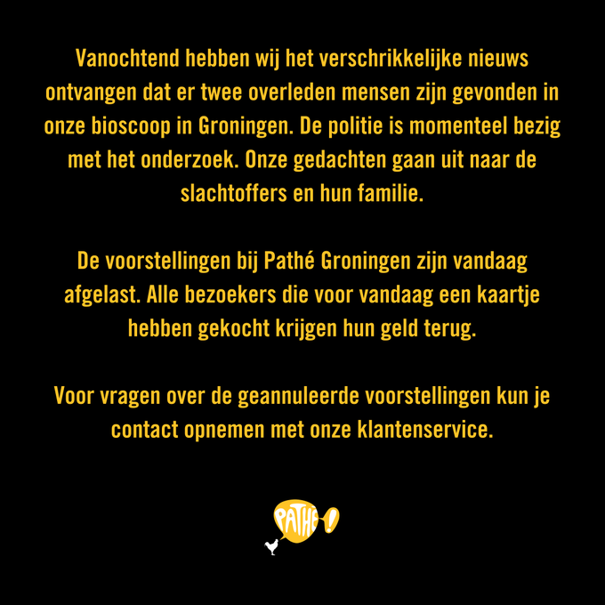 Na een melding hebben wij vanochtend twee overleden mensen aangetroffen in een bioscoop aan het #gedempteZuiderdiep in #Groningen. Wij zijn met meerdere collega’s aanwezig en doen onderzoek. De omgeving is afgezet. Meer info is op dit moment niet bekend.
