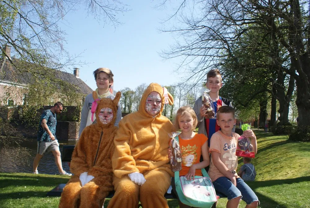 De kinderen zwermden uit over de tuinen en singels rond de borg, onder aanvoering van de grote en kleine paashaas. De beide paashazen en hun helpers hadden twee gouden en twee zilveren eieren verstopt in de tuinen en de singels rond Verhildersum. En meer dan 2000 chocolade paaseitjes.