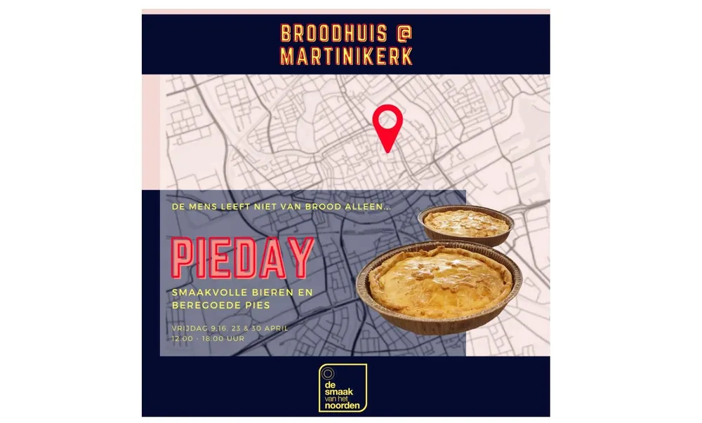Daarom biedt De Smaak van het Noorden iedere vrijdag huisgemaakte Pies, in een vegetarische en een vlees/vis variant. Er zal worden gevarieerd en zo is het iedere keer weer een verrassing welke smaken er zijn. Per verkochte Pie gaat er 1 euro naar de historische orgels van de Martinikerk. Tussen 12.00 uur en 18.00 uur is het Friday Pieday vanuit het Broodhuisje van de Martinikerk.