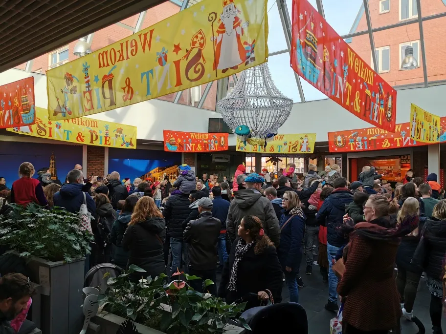 Veel kinderen, ouders en winkelend publiek waren afgekomen op het bezoek van Sinterklaas en zijn Pieten aan het winkelcentrum.