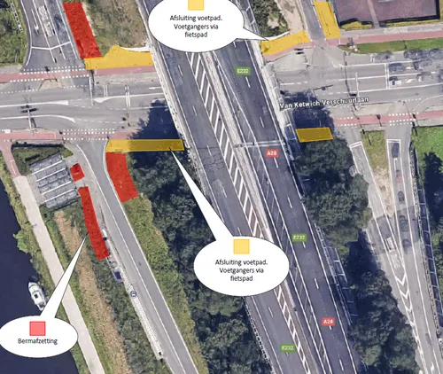 Het voetpad onder het A28-viaduct aan de Van Ketwich Verschuurlaan is van maandag 7 april om 7.00 uur tot en met vrijdag 11 april om 17.00 uur afgesloten. Het pad wordt afgesloten vanwege het aanleggen van kabels bij de nabijgelegen bushaltes.