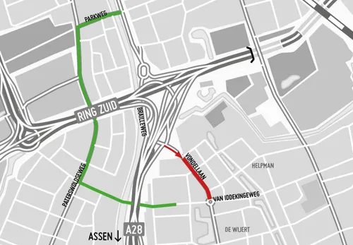 Ook een deel van de Brailleweg, vanaf de afrit 40 Groningen-Centrum richting de Vondellaan, is in één richting dicht. De afrit blijft beschikbaar, maar verkeer kan niet rechts afslaan richting De Wijert.
